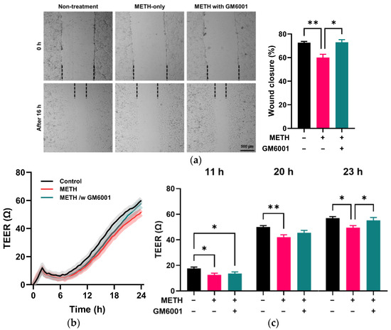 GM6001 treatment promoted wound closure in METH-administered RRMECs (p < 0.05, n = 3, Figure 6a) compared to those administered METH-only. In addition, the TEER assay (Figure 6b,c) showed that GM6001 treatment significantly increased resistance in METH-administered RRMECs compared to those administered METH alone (p < 0.05, n = 6).