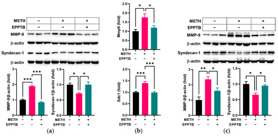TAAR-1 is one of the major receptors [21,22] that can be activated by METH in endothelial cells [23]. We tested whether TAAR-1 mediated endothelial dysfunction induced by METH in RRMECs and cultured OA by using EPPTB, a specific TAAR-1 antagonist. As shown in Figure 7a,b, EPPTB treatment effectively reversed the alterations of MMP-9 and syndecan-1 at protein (p < 0.001 for MMP-9 and p < 0.05 for syndecan-1, n = 3, Figure 7a) and mRNA levels (p < 0.05 for MMP-9 and p < 0.001 for syndecan-1, n = 5–6, Figure 7b) in METH-administered RRMECs, compared to cells administrated METH alone. In cultured OA, the increased protein level of MMP-9 and decreased protein level of syndecan-1 by METH administration were significantly reversed in OA incubated with METH in the presence of EPPTB (p < 0.05 for MMP-9 and syndecan-1, n = 3), compared to the METH-only administered group (Figure 7c).