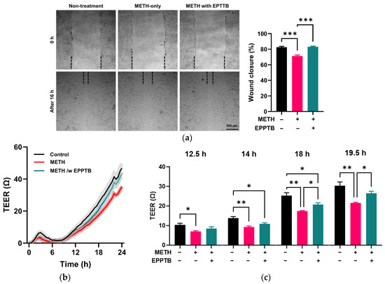 In addition, EPPTB treatment enhanced wound closure in METH-treated RRMECs (p < 0.001, n = 3, Figure 8a) compared to the METH-only group. The TEER assay (Figure 8b,c) showed that resistance began to change significantly at 12.5 h following METH administration, compared to the control group (p < 0.05, n = 6). However, in the presence of EPPTB, METH-treated cells did not show a significant difference compared to the control group until 14 h. By 18 h, EPPTB treatment significantly increased resistance in METH-administered RRMECs compared to those treated with METH alone. At 19.5 h after treatment, there were no significant changes in resistance between control vs. METH with EPPTB administration.