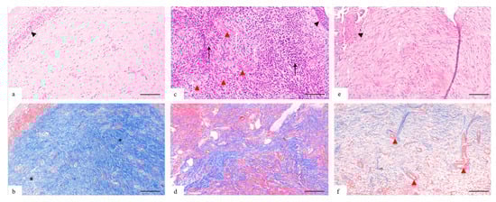 Morphological histophenotypes of the extracellular matrix of the cervical stroma. (a,b)—Normal histological pattern of the control group. The stroma is represented by compact, parallel-oriented bundles of type I collagen (*) with the uniform distribution of mature fibroblasts. There are no myxoid changes and inflammatory infiltrates. Cellularity is low, inflammatory infiltration is not detected. (c,d)—Histopathological pattern associated with inflammation and dysplastic lesions of the cervix. Moderate disorganization of the stromal framework: the fibers are thickened, fragmented, oriented chaotically: areas of reduction and rupture are registered. The moderate amount of myxoid tissue is detected between the fibers (white arrows). Stroma cellular capacity is significantly increased due to fibroblasts, lymphocytes, and mononuclear cells (black arrows). (e,f)—Histopathological pattern associated with dysplasia: its persistence and progression. The histopathological pattern is represented by the loss of the organized collagen network and its replacement by the myxoid matrix (white arrows). Thin-walled vessels are seen in the stroma (red arrowhead). (a,c,e)—Hematoxylin and eosin staining, 100× magnification, scale bar 200 μm. (b,d,f)—Histochemical staining of collagen proteins with Masson’s trichrome, 100× magnification, scale bar 200 μm. Symbols: black arrow tip—epithelium; black arrows—cellular infiltration; white arrows—myxoid stroma; *—type I collagen fibers, red arrow tip—microvessels.