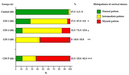 Frequency of cervical stromal extracellular matrix histophenotypes (normal, intermediate, myxoid) in groups defined by epithelial dysplasia (CIN1–3) and among cases with progression/persistence of CIN. Abbreviations: CIN—cervical intraepithelial neoplasia, CIN P—cervical intraepithelial neoplasia with progression/persistence 6 months after treatment or dynamic follow-up *—Statistically significant difference versus of control group (p < 0.05); **—Statistically significant difference versus of control group and CIN 1, CIN 2 (p < 0.05); ***—Statistically significant difference versus of control group and CIN 1, CIN 2, CIN 3 (p < 0.05). Abbreviations: CIN—cervical intraepithelial neoplasia, CIN P—cervical intraepithelial neoplasia with progression/persistence 6 months after treatment or dynamic follow-up.