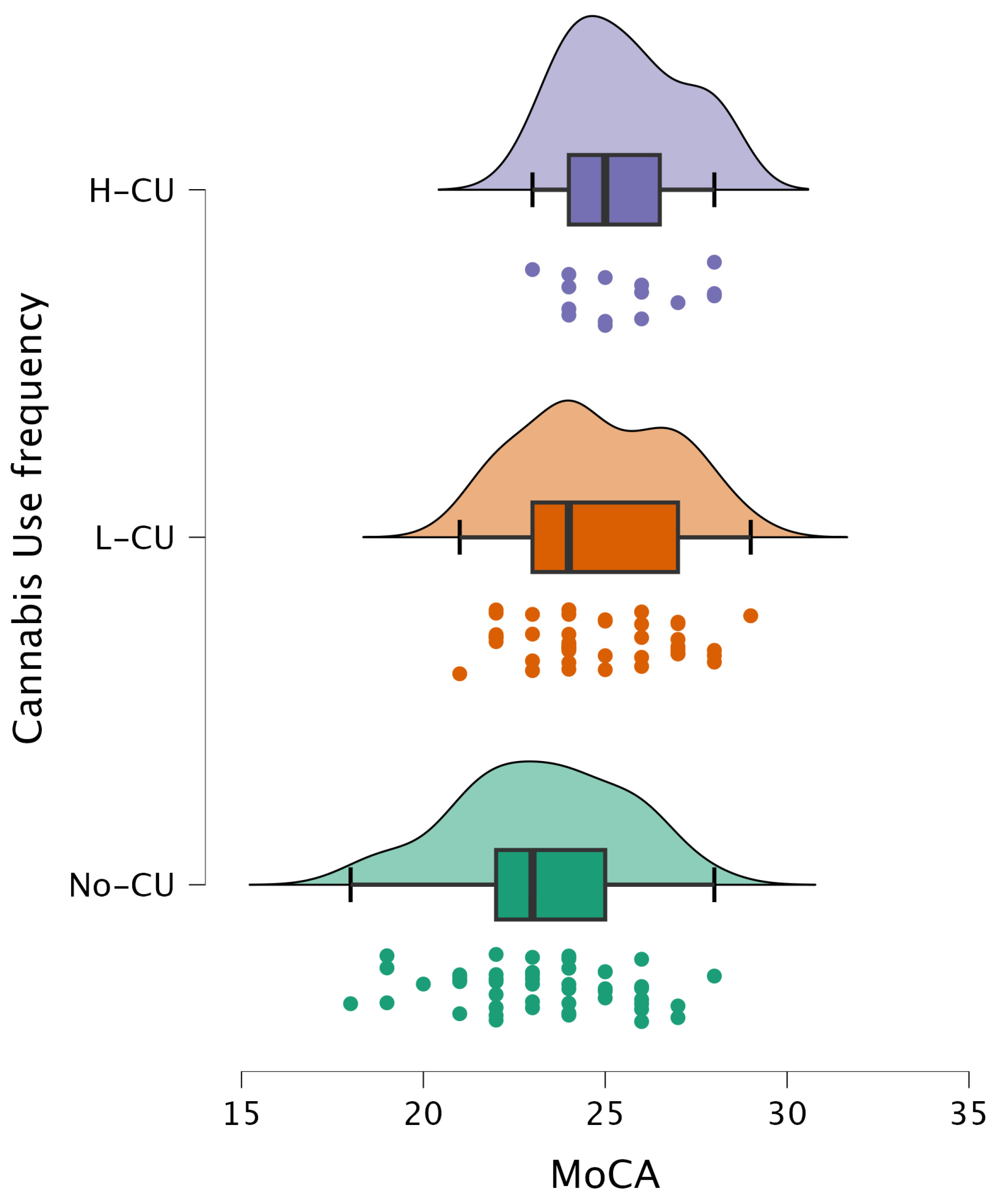 Figure 2. Distribution of MoCA scores across cannabis use frequency groups. Participants were categorized as non-users (No-CU), low-frequency users (L-CU), and high-frequency users (H-CU).