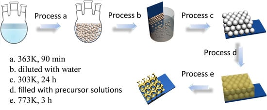 3DIO WO3 films were prepared by the sacrificial template method with a PMMA latex sphere opal as a template which was synthesized by methyl methacrylate [,]. The possible synthesis scheme of preparing the 3DIO WO3 films is shown in Figure 1 schematically, and descriptive processes were as follows: Firstly, the preparation of the PMMA spheres’ opal films: a stoichiometric amount of potassium persulfate was dissolved in deionized water before methyl methacrylate was added, and then the mixture was sintered for 90 min at 363 K in an oil bath to obtain PMMA latex spheres. Then, the obtained PMMA latex spheres were diluted with deionized water to form a 5% solid content colloid suspension. After that, the glass substrates, which were immersed into sulfuric acid for 2 h and washed with deionized water, were initially inserted into the aqueous colloid suspension vertically. Finally, the whole setup was placed in a 303 K oven for 24 h and then thin opal templates would self-assemble on the glass substrates with the evaporation of the water solvent. Secondly, the filling of the precursor solution: lacunas of the as-prepared thin opal templates were filled with the precursor solutions, which contained 0.08 M ammonium metatungstate hydrate and 0.26 M citric acid as a complexing agent by capillary force. Thirdly, the obtaining of the 3DIO WO3 films: the obtained films were placed in a tube furnace to remove the polymer spheres completely with a rising speed of 1 K/min to 773 K and sustained for 3 h, and the 3DIO WO3 films were finally obtained.