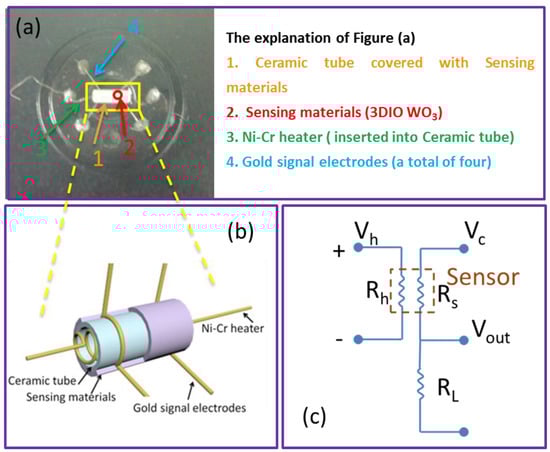 (a) Photograph of the 3DIO WO3 gas sensor, (b) the schematic structure of the gas sensor, and (c) the schematic diagram of the electrical circuit for measuring the 3DIO gas sensor.