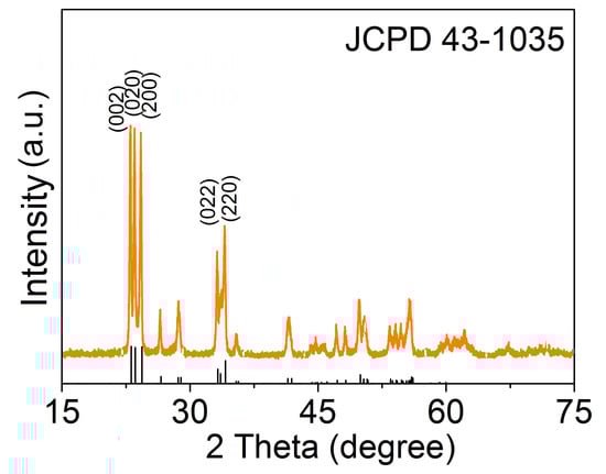 XRD was first implemented to confirm the phase composition and crystallinity of the 3DIO films. As shown in Figure 3, XRD typical pattern of 3DIO films proved that the crystal phase of the films was WO3, and the diffraction peaks were readily indexed to (002), (020), and (200) reflections of the monoclinic WO3 phase, which agreed well with the reported values from the Joint Committee on Powder Diffraction Standards card (JCPDS card 43-1035). Moreover, no other diffraction peaks were observed, indicating the absence of other impurities.