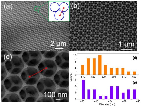 SEM images of (a) PMMA sphere opal films, (b) 3DIO WO3 sample, and (c) the enlarged SEM images of 3DIO WO3 on the glass substrate. (d,e) The size distribution of the PMMA spheres and 3DIO WO3 center-to-center distance, and the size distribution were estimated by measuring 60 cells. The inserted picture of (a) is the enlarged scheme of the PMMA in the green box. The red arrows in (a,c) revealed the center-to-center distances of PMMA spheres and 3DIO WO3, respectively.