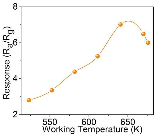 The 3DIO nanostructure is a promising candidate as a gas sensor. The unique structure is capable of providing a large surface to volume ratio and good permeability, which is desirable for the adsorption and diffusion of target gases in sensor materials [,]. The 3DIO WO3 gas sensor was fabricated according to the above method and studied carefully. All of the sensors are placed under room temperature in an air atmosphere, and the whole testing process is also accomplished at room temperature. Considering the significant influence of the operating temperature on the sensitivity of gas sensors, the gas sensor was tested at different temperatures to determine the optimum operating conditions for acetone detection first []. Through controlling the heating voltage Vh of the Ni–Cr alloy wire in Figure 2c, various operating temperatures are acquired. Figure 5 depicts the response curve of the 3DIO WO3 gas sensor towards 5 ppm acetone gas as a function of the working temperature, and the lines are spline curves, which are used to show the relationships between the response and the working temperature vividly. It is observed that the 3DIO gas sensor shows typical n-type sensing characteristics—the response curve increases, at first, until reaching a maximum, and then decreases with the increase of the working temperature. Therefore, the gas sensor reacts most effectively at a particular temperature. In our case, the optimal working temperature is ~643 K and its corresponding response is ~7.0 for 5 ppm acetone.