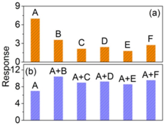 (a,b) Selective test of 3DIO WO3 sensor for 5 ppm target gases at ~643 K respectively (A = acetone, B = ethanol, C = methanol, D = methanal, E = toluene, and F = ammonia).