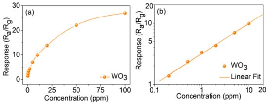 Responses of the 3DIO WO3 sensor to different acetone concentrations in the normal coordinate system (0.2–100 ppm) (a) and log-log coordinate system (0.2–10 ppm) (b).