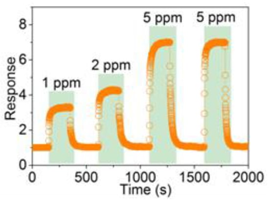 In addition, the response performance of the 3DIO is further investigated at the working temperature of ~643 K. Figure 8 shows four dynamic processes of the sensor when exposed to different and the same acetone concentrations. As shown, the sensor responses all increased quickly when exposed to acetone gas and returned to its initial state when withdrawn from acetone gas within the four cycles. Additionally, the 3DIO sensor response increases linearly with the increase of acetone concentration, and is almost the same when detecting an identical concentration acetone gas. Based on the dynamic response curves of 5 ppm in Figure 8, the corresponding τres and τrec of the 3DIO sensor are calculated to be ~10 and 34 s, respectively.