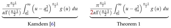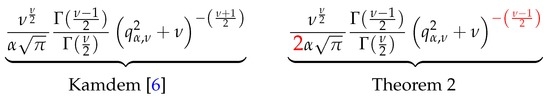 Conversely, combining this expression from the univariate case with the location-scale properties of the multivariate Student t distribution (as an elliptical distribution) with respect to and can also be used to reconcile our expressions in Theorem 2 with the ones that can be obtained following the approach by [37] (Theorems 1 and 2), which precedes the inaccurate results in [6] that we correct. The consistency of our results in the univariate case also readily applies to general elliptical distributions. By contrast, the formulas contained in both [3,6] for elliptical distributions and multivariate Student t distributions are not consistent with the respective univariate formulas.