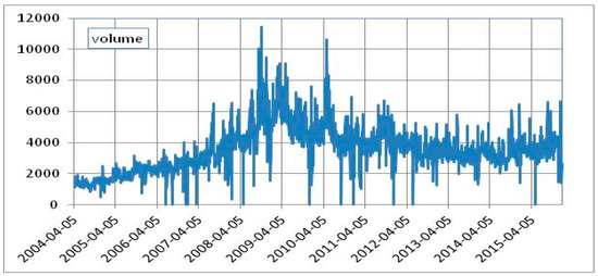 Figure 1 shows the evolution over time of the daily trading volume, Figure 2 shows the values of opening and closing and Figure 3 shows the daily minimum and maximum values. These three figures show the period from 5 April 5 2004 to 31 December 2015. Figure 2 and Figure 3 clearly show the consequences of the 2009 crisis on the data presented.