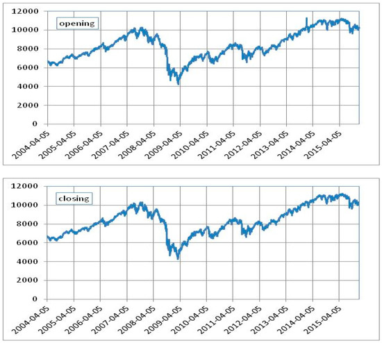 Evolution over time of the values of opening (above) and closing (below) of the NYSE Composite US 100 between 5 April 2004 and 31 December 2015.