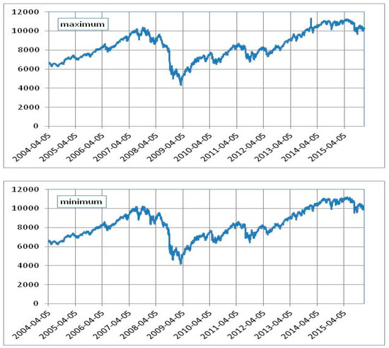 Evolution over time of the values of daily maximum (above) and minimum (below) of the NYSE Composite US 100 between 5 April 2004 and 31 December 2015.