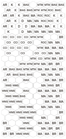 The index of overbought and oversold of Williams is a momentum indicator based on the relationship between the difference of the maximum value and the closing value of the difference between the maximum and minimum values within the last nine days, calculated by Equation (6). In this equation, HP 9 and LP 9 correspond respectively to the maximum and minimum values of the last nine days