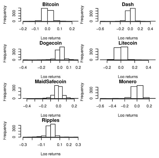 Table 2 gives the summary statistics for the log returns of the exchange rates of the seven cryptocurrencies. Here, the log returns show some slightly different results. Dash, MaidSafeCoin, and Monero have the lowest minimum values, while Dash and Litecoin have the largest maximums. The means and medians of the log returns of all seven currencies are similar and almost equal to zero. Only the log returns of Bitcoin and Litecoin are positively skewed, all others are negatively skewed with Dogecoin being the most significant. Log returns of all seven currencies have a peakedness significantly greater than that of the normal distribution, with the most peaked being those of Dash, Dogecoin, and Litecoin. Noteworthy, as much has been discussed about the volatility of Bitcoin returns, the log returns of Bitcoin have the lowest variance and standard deviation of the seven cryptocurrencies. Those with the highest variation are Dash, and perhaps unexpectedly, MaidSafeCoin and Monero.