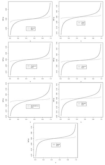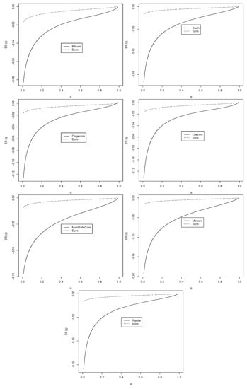 respectively, for . Plots of VaR and ES for the best fitting distributions for the seven cryptocurrencies are shown in Figure 4 and Figure 5. Also shown in the figures are estimates of VaR and ES for daily log returns of the Euro computed using the same best fitting distributions. It is clear that each cryptocurrency is riskier than the Euro. With respect to the upper tail of VaR, Litecoin, MainSafecoin and Monero appear to have the largest risks. With respect to the lower tail of VaR, Monero appears to have the largest risk. Monero also has the largest risk with respect to the lower tail of ES.
