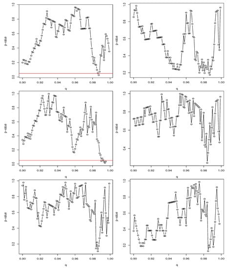 Kupiec’s p-values for the best fitting distributions for daily log returns of the exchange rates of Bitcoin (first row, left), Dash (first row, right), Dogecoin (second row, left), Litecoin (second row, right), MaidSafeCoin (third row, left), Monero (third row, right) and Ripple (last row) from 23 June 2014 until 28 February 2017.