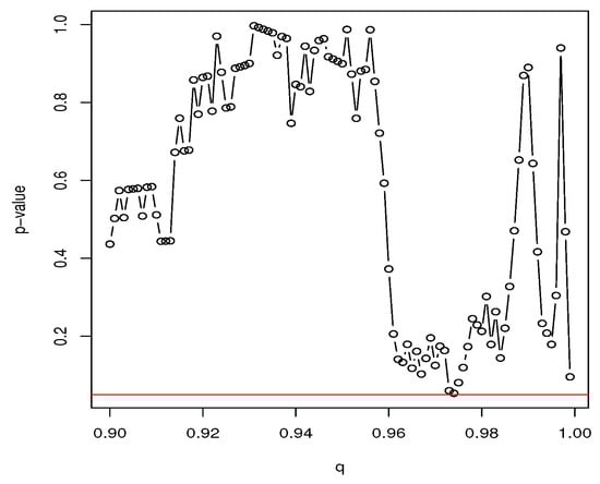 The p-values of Kupiec’s test for the best fitting distribution for each of the seven cryptocurrencies are shown in Figure 6. The p-values (points above 0.05 in Figure 6) suggest that the out of sample performance of VaR can be considered accurate at the corresponding values of q for any of the best fitting distributions. The motivation for using the Kupiec’s test is that we can give predictions of the exchange rate of the different cryptocurrencies, including predictions for the extreme worst case scenario and the extreme best case scenario.