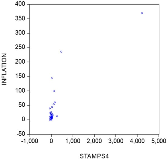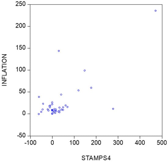 Figure 3 and Figure 4 provide scatters of inflation versus the percentage changes in stamps prices. The first scatter covers all data, whereas Figure 4 concerns the data except 1994. A first impression is that there may exist a positive relationship between the two series.