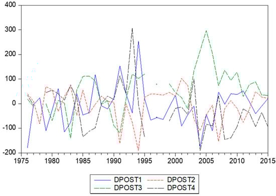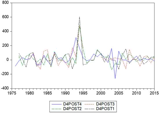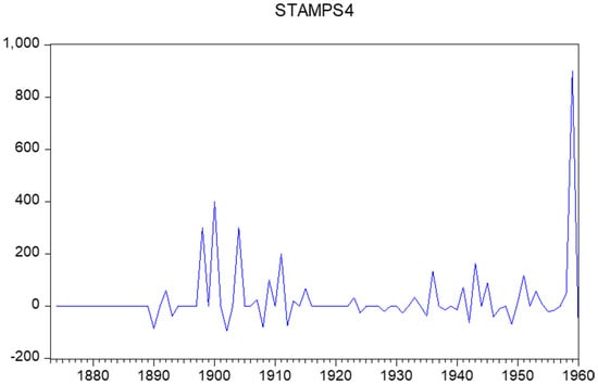 In this section, we consider two econometric models to link inflation with changes in stamp prices. We denote annual inflation as and the annual changes in stamps prices as . For inflation, we have only annual data, but for the stamps prices, we can also construct quarterly data. Each year, a range of stamps was issued, and this allows us to construct quarterly percentage changes, as the catalogues give the exact dates (day, month, and year) of issue. There are now two ways to compute these changes in postal stamps prices. The first refer a current quarter with the previous quarter—that is, the first-order differences. We denote these as , where T again corresponds with years and q with the quarters 1, 2, 3, and 4. The data appear in Figure 5. The second type of percentage changes concern the differences between a current quarter and the same quarter the year before. We denote these as , as these concern fourth-order differences. The data are depicted in Figure 6.