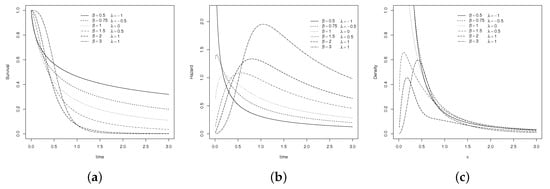where , and . Since the distribution was proposed to model experiments in reliability analysis, Figure 1 presents several examples of survival, probability density and hazard rate functions for different values of the parameters.