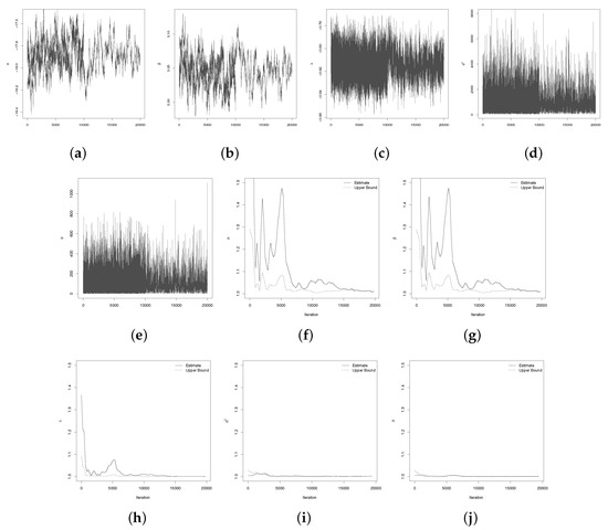 The convergence of the chain was verified by Gelman and Rubin’s convergence diagnostic criterion, see for example (Gelman and Rubin 1992), which demonstrate that these criteria is satisfied (Table 3). Also, the convergence can be seem in Figure 3a–j.