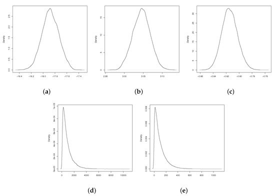 Also, the marginal posterior densities for , and , respectively, can be analyzed by the Figure 4a–e.