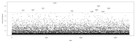 According to Lee et al. (2006), can be approximated by the estimated covariance and variance matrix. Some possible influence points are identified in the LD plot, Figure 6.