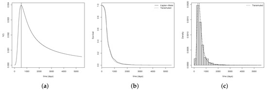 (a) Hazard estimate curve, with the , (b) survival curves and (c) histogram.
