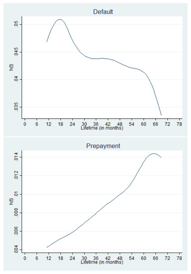 Baseline hazards for default and prepayment. The figure displays the estimates of the baseline hazards for default and prepayment. The estimate of the baseline hazards for event type j () is obtained using the maximum likelihood estimates of and () from Model (1) and the lifetimes of loans from the onset of foreclosure.