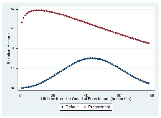 Table 3 also lists the estimated parameters of expo-power distribution. Using these estimates from Model (1), Figure 2 presents the baseline hazards for default and prepayment. As shown in Figure 2, the baseline hazard for default appears to be inverted U-shaped. That is, the likelihood of default increases in the first months, reaches a peak and then decreases. The baseline hazard for prepayment features an initial increase followed by a gradual decrease. Note that at all time points, the baseline hazard for prepayment is higher than the baseline hazard for default. This means that, in the absence of covariates, the chance of prepayment for loans in foreclosure proceedings is higher than the chance of default.