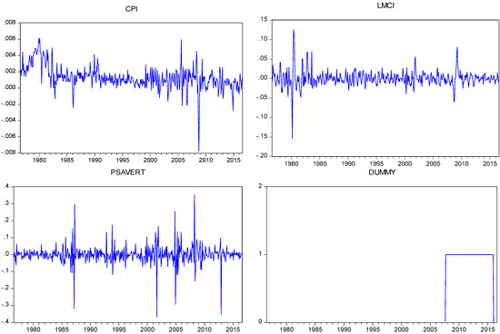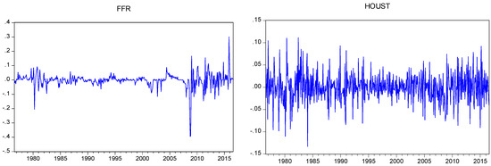 In this study, we analyze the interaction between different markets and interest rate policy of the Fed in the management of SMC. For this purpose, we examine this relationship through an MRS-Regression analysis. The model we determine consists of six variables: FFR, new privately-owned housing unit (HOUST), inflation rate (CPI), change in labor market conditions index (LMCI), personal savings index (PSAVERT), and dummy variable for the SMC period. The data for empirical analysis was obtained through the Federal Reserve Bank of St. Louis’ database. The period we study is August 1976–August 2016, and the data displays monthly frequency. In Figure 1, we present the log-differences of the respective time series. As can be seen, while the HOUST variable is extremely volatile in each period, FFR exhibits fluctuation, especially between the years 2007 and 2016. Conversely, PSAVERT is highly variant in the years 1987, 2002, 2005, and 2008.