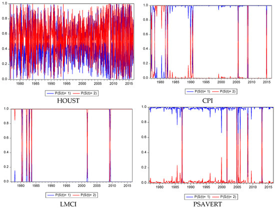As can be observed from the results in Table 4, we estimate four different MRS-Regression models, in each, the independent variable is FFR. We also present the filtered regime probabilities in Figure 2. In order to identify the temporal effect of policy changes, in our analysis, we employ different lags for each variable. In addition to the lags, we also employ a common dummy variable in each model. This variable represents the SMC period in which the Fed exercise a loose monetary policy with very low interest rates. As the MRS-Regression model does not label the regimes, for this analysis we need to define and name the regimes for each model. Referring to the sign in the coefficient of constant variable we can assert that for all models, Regime 1 involves expansion and Regime 2 includes recession cycles. For instance, the positive sign in the constant variable of the first model indicates a positive value in housing statistics which is the indicator of expansion period. As for the dummy variable, it takes value of 1 in period of September 2007–December 2015 and 0 in remaining dates. By starting from 18 September 2007 until 17 December 2015 the Fed decreased the FFR continuously with following rates: 4.75, 4.50, 4.25, 3.50, 3.00, 2.25, 2.00, 1.50, 1.00, and 0.25%. Since in this period, the Fed implemented a loose monetary policy, significance of a dummy variable would be a success sign of the Fed for this specific period.