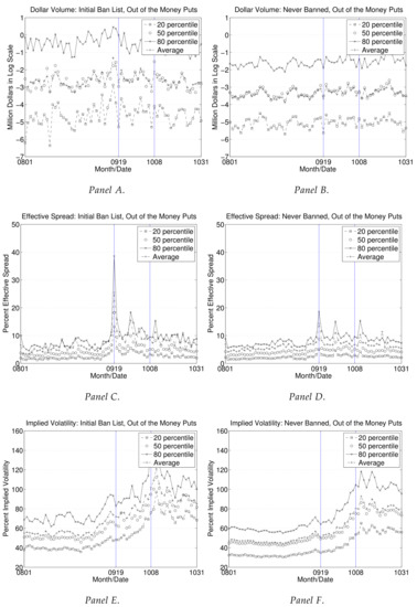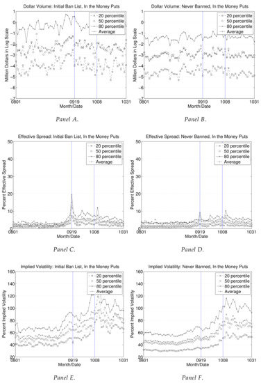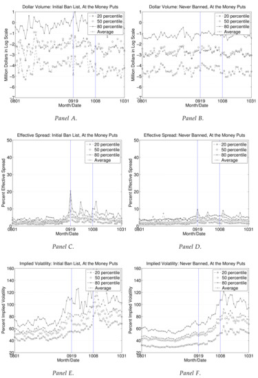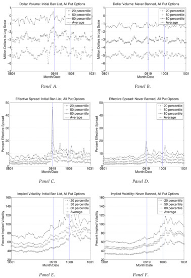 Figure 1 plots the cross sectional means and 20th, 50th and 80th percentile values of dollar volume, percent effective spread and percent implied volatilities through August, September and October 2008 for call options. Spreads and implied volatilities are calculated dollar weighted within the trades of a stock during the day and the cross sectional summary statistics are reported. Figure 1A,C,E reports for Initial Ban List and Figure 1B,D,F for Never Banned Stocks. Figure 1 provides results that support Table 2A. Figure 1A shows that call dollar volumes slightly declined with the introduction of the ban and during the ban, and were especially low during the post-ban period when compared with the pre-ban period. Figure 1B portrays a similar trend for Never Banned Stocks. In particular, comparing the pre-ban period with during the ban in Figure 1A,B, it is hard to conclude that the call options of the two groups of stocks were dramatically differently affected. Figure 1C shows how call spreads increase considerably on 19 September, the first day of the ban, and then drop dramatically, although still to a higher level than before the ban. The reason for the spike is likely that option market makers thought they would never be able to hedge until the end of the ban, while eventually they were able to, since their one day (Friday) exemption was extended during that weekend. We understand that the SEC extension release (34-58611) was very helpful in lowering the spreads. Figure 1D shows that Never Banned Stock call option spreads were affected similarly but the effects are much less pronounced. One reason for the presence of any effect might be the regulatory uncertainty that introduced the risk of a ban to just about any stock. Figure 1E,F shows that implied call volatilities of both categories of stocks increased steadily during the ban and settled at level in the after the ban period that is much higher than before ban or during the ban. The trends and magnitudes are very similar for the two categories of stocks. The incremental impact on the Initial Ban List stock option implied volatilities is a small 2.5%. From the view point of this Equation (5) result and visually from Figure 1E,F, it is hard to conclude that the call option implied volatilities were drastically different across the two categories of stocks. Figure 2 provides results that support Table 2B. Figure 2A,B visually presents why we find insignificant dollar volume changes for put options in Table 2B. There is hardly any discernable clear pattern in the put dollar volume for either group of stocks. Figure 2C,D shows the impact on the put spreads for the two groups. For both groups, there is a stark increase on 19 September, and spreads come down immediately after, although remain higher when compared to the pre-ban period. The increases and the levels are lower than the call options. Figure 2E,F shows the impact on the implied volatilities. The difference-in-difference change for the Initial Ban List stocks reported in Table 2 is about six percent over and above a non-ban period average of 80 percent. Visually, it is hard to discern the obvious dramatic way in which one of the group’s put option implied volatilities behaved differently than the other’s.
