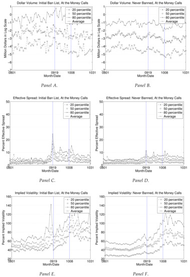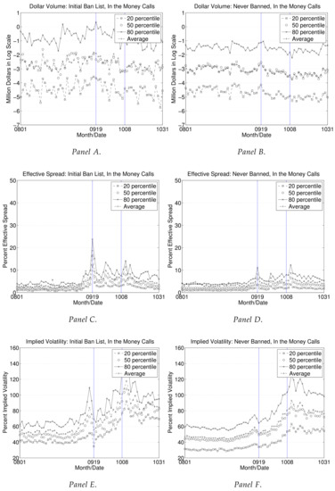 Figure 3 and Figure 4 plot the associated cross sectional means and the 20th, 50th and 80th percentile values of dollar volume, percent effective spread and percent implied volatilities through August, September and October 2008 for calls and puts. Comparing Figure 3A,B help us understand the positive relative dollar volume change for at the money Call options (some three hundred and twenty thousand dollars per underlying per day as reported in Table 3A). The volume after the ban period is particularly low for Initial Ban List stocks, with little change for either of the two groups of stocks entering the ban period. Figure 4A,B for put options seems to show that, entering the ban period, there is little change in either groups’ dollar volume though, exiting the ban period the dollar volumes seem to fall for both. The relative effect for dollar volume reported for put options in Table 3B is statistically insignificant. Comparing Figure 3C,D with Figure 1C,D for All call options, we understand that spreads are in general smaller and had a smaller spike on 19 September. Comparing Figure 4C,D with Figure 2C,D for All put options reveals a similar result. Focusing on implied volatilities of put options, Figure 4E shows that the ban has the effect of stopping the upward trend for the Initial Ban List stocks. For Never Banned Stocks, on the other hand, Figure 4F shows that implied volatilities continued to trend up during the ban period and stabilize and start falling only after the ban period. Figure 3E,F portray a slightly different picture for calls. As Figure 3E shows for the Initial Ban List stocks, the ban had the effect of reducing the implied volatilities especially early in the ban, although the implied volatilities have an up trend during the ban similar to the implied volatilities of the Never Banned stocks, as Figure 3F shows.