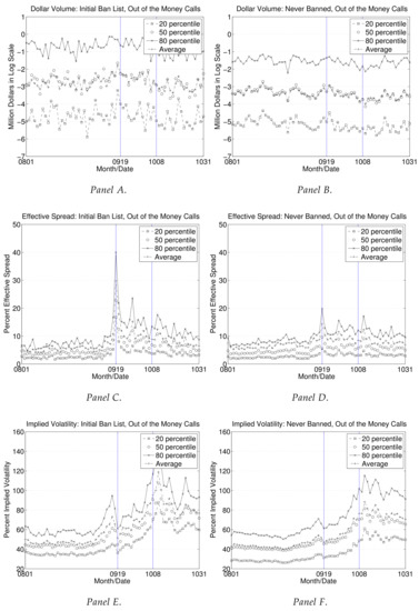 Table 4 reports the results for Out of the money options. Focusing on the relative effects reported in the last two columns of Table 4A for call options, all 12 variables increase and exhibit statistical significance. Spreads go up by slightly less than At the money call options. One reason might be that delta hedging a long position in an out of the money call position requires shorting less stock compared with an at the money option. Turning to the put option results reported in Table 4B, spreads, prices and implied volatilities go up and are statistically significant. Dollar volume is statistically insignificant. Spreads go up by about 3% and 2% (quoted and effective, respectively), prices by slightly less than 50 cents and implied volatilities by about 6%. When compared to the averages in the non-ban period, these magnitudes appear modest. Figure 5 and Figure 6 are the supporting figures for Out of the money calls and puts. It is hard to find a large difference in the way the ban affected the Out of the money call dollar volumes by considering Figure 5A,B. Figure 6A,B portrays a similar picture for the puts. Focusing on spreads, Figure 5C shows that on 19 September spreads skyrocketed for calls of the Initial Ban List stocks. Figure 5D shows that the spreads of the Never Banned Stocks were also affected in a similar way but the magnitudes are much smaller. Figure 6C,D reports the spreads for the put options. Comparing Figure 5C and Figure 6C, the size of the 19 September effect and the overall effect appears slightly smaller for puts than calls. Turning to the implied volatilities, Figure 5E,F and Figure 6E,F show that the impact is fairly similar to the impact for the At the money options (compare the same plots across Figure 3 and Figure 4 with Figure 5 and Figure 6). In particular, the Never Banned Stock option implied volatilities has an upward trend during the ban for calls and puts. For the Initial Ban List stocks, the upward trend flattens for the put options with the ban and drops initially then continues to increase for calls.