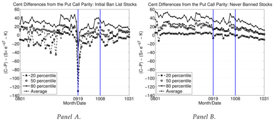 Lastly, we consider how the put–call parity is affected during the ban. A time series plot of the cross section of put–call parity violations suggest that the violations are most pronounced on 19 September, and drastically shrank immediately after. Measures similar to ours were constructed and studied by Ofek et al. (2004) and Cremers and Weinbaum (2010).