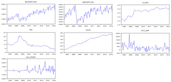The time period analyzed starts from January 2007, the month when Romania became a member of the European Union, to August 2014. Therefore, the study covers an 8-year period, both recession and economic recovery, and demonstrates how the exchange rate evolves and influences other variables within different economic circumstances. We also intended to analyze the crises and any available data post-crises periods, when the international commercial trade and competitiveness were affected. We wanted to demonstrate how the exchange rate evolves and influences the dependent variables Imports and Exports. The time series used in the empirical analyses are presented in Figure 1.