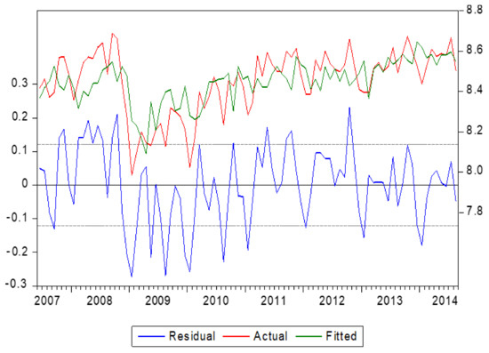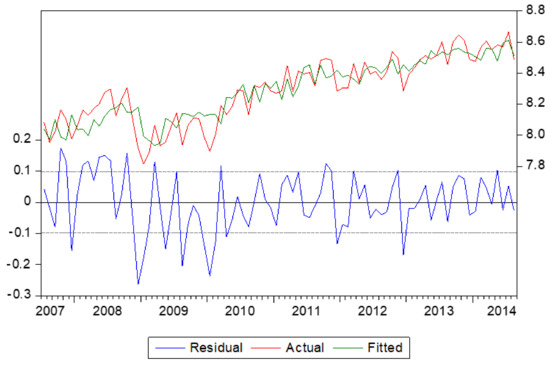 The most significant differences between the regression pattern of imports and the existent evolution of time series are identified within the financial crisis period, respectively from 2008 until 2010, during the financial crisis, upon a general decrease of international trading (Figure 3). In the chart, the first line with scale values between −0.3 to 0.3 represents the residuals of the model, while the following two lines with values on the scale from 7.8 to 8.8 characterize the fitted and actual values of the model.