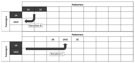 The process begins with reading the value of pedestrian scenarios 1A (1 Adult) and 1C (1 Child) directly from Table 3. From these values we can calculate the value of the passenger scenario 1A1C (1 Adult and 1 Child on board) using the pedestrian scenarios 2A, 1A1C, and 2C and averaging the results. We continue the process working through the values on Table 3 downwards and to the right. This iterative process is shown graphically in Figure 2.