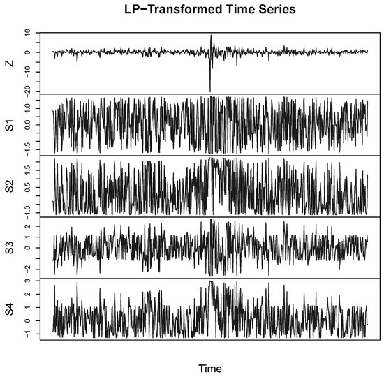 The data used in this paper are daily S&P 500 return data between 2 January 1963 and 31 December 2009 (defined as , where is the closing price on trading day t). We begin our modeling process by transforming the given univariate time series into multiple (robust) time series by means of special data-analytic construction rules described in Equations (4)–(6) and (7). We display the original “normalized” time series and the transformed time series on a single plot.
