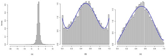 For , Figure 2b displays the histogram of for . The corresponding comparison density estimate is shown with the blue curve, which reflects the fact that the distribution of daily return (i) has a sharp peaked (inverted “U” shape) and (ii) is negatively skewed with (iii) fatter tails than the Gaussian distribution. We can carry out a similar analysis by asking whether the t-distribution with two degrees of freedom provides a better fit. Figure 2c demonstrates the full analysis, where the estimated comparison density indicates that (iv) the t-distribution fits the data better than normal, especially in the tails, although not a fully-adequate model.