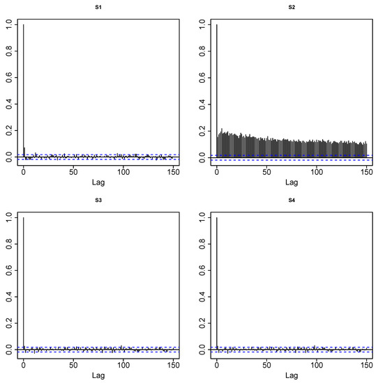 Figure 4 shows the LP-correlogram of S&P stock return data. Panel A shows the absence of linear autocorrelation, which is known as an efficient market hypothesis in finance literature. A prominent auto-correlation pattern for the series (top right panel of Figure 4) is the source of nonlinearity. This fact is known as “volatility clustering”, which says that a large price fluctuation is more likely to be followed by large price fluctuations. Furthermore, the slow decay of the autocorrelation of the series can be interpreted as an indication of the long-memory volatility structure.