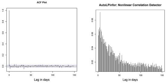 An excellent discussion of the role of information theory methods for unified time series analysis is given in Parzen (1992) and Brillinger (2004). For an extensive survey of tests of independence for nonlinear processes, see Chapter 7.7 of Terasvirta et al. (2010). AutoLPinfor is a new information theoretic nonlinear autocorrelation measure, which detects generic association and serial dependence present in a time series. Contrast the AutoLPinfor plot for S&P 500 return data shown in Figure 5 with the ACF plot (left panel). This underlies the need for building a nonlinear time series model, which we will be discussing next.