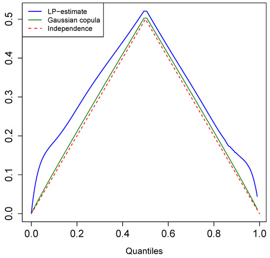 Our nonparametric estimate of the quantile correlation function is based on the LP-copula density, which we denote as . Figure 7 shows the corresponding quantile correlation plot for S&P 500 data. The dotted line represents QCF under the independence assumption. Deviation from this line helps us to better understand the nature of asymmetry. We compute using the fitted Gaussian copula: