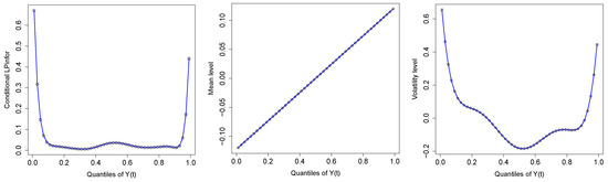 At this point, we can legitimately ask: What aspects of the conditional distributions are changing most? Figure 8b,c displays only the two coefficients and for the S&P 500 return data for the pairs . These two coefficients represent how the mean and the volatility levels of the conditional density change with respect to the unconditional reference distribution. The typical asymmetric shape of conditional volatility shown in the right panel of Figure 8b,c indicates what is known as the “leverage effect”; future stock volatility negatively correlated with past stock return, i.e., stock volatility tends to increase when stock prices drop.