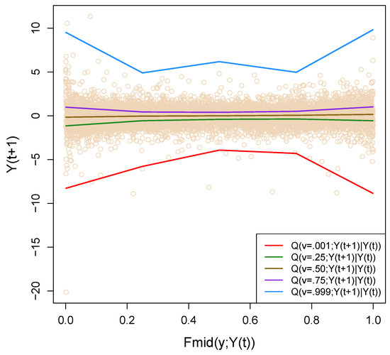 Next, we proceed to estimate the nonparametric conditional quantiles , for , from the simulated data. Figure 10 shows the estimated conditional quantiles. The extreme conditional quantiles have a special significance in the context of financial time series. They are sometimes popularly known as Conditional Value at Risk (CoVaR), currently the most popular quantitative risk management tool (see Adrian and Brunnermeier (2011); Engle and Manganelli (2004)). The red solid line in Figure 10 is , which is known as the 0.1% CoVaR function for a one-day holding period for S&P 500 daily return data. Although the upper conditional quantile curve (blue solid line) shows symmetric behavior around , the lower quantile has a prominent asymmetric shape. These conditional quantiles give the ultimate description of the auto-regressive dependence of S&P 500 return movement in the tail region.
