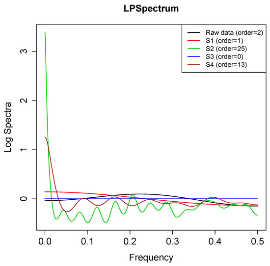 Here, we extend the concept of spectral density for nonlinear processes. We display the LPSpectrum -Autoregressive (AR) spectral density estimates of . The spectral density for each LP-transformed series is defined as:
