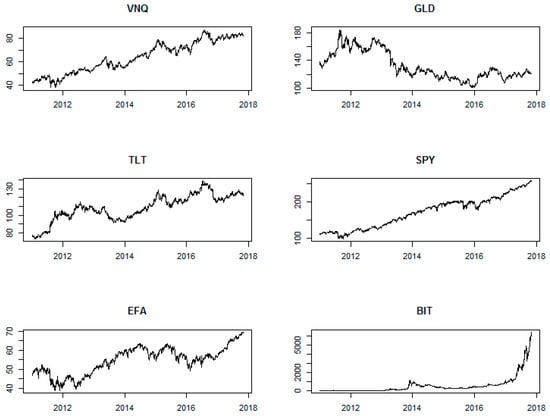 Daily stock price data are collected on five exchange traded funds (ETFs) and the price of bitcoin. The ETFs consist of US equities (SPY), US bonds (TLT), US real estate (VNQ), Europe and Far East equities (EFA), and gold (GLD). Ticker symbols are listed in parentheses. These are widely traded ETFs and form the basis of many portfolio allocation strategies. GLD is an ETF backed by physical gold and movements in the price of GLD are meant to reflect movements in the price of gold bullion. ETF data is downloaded from Yahoo Finance and bitcoin prices (BIT) are downloaded from Coindesk. The daily data cover the period of 4 January 2011 to 31 October 20174. The starting period is chosen based on the start of bitcoin trading. Time series plots clearly show that VNQ, TLT, SPY, and EFA display similar upward trending patterns, while GLD has been trending down and BIT displays an exponential growth pattern (Figure 1).